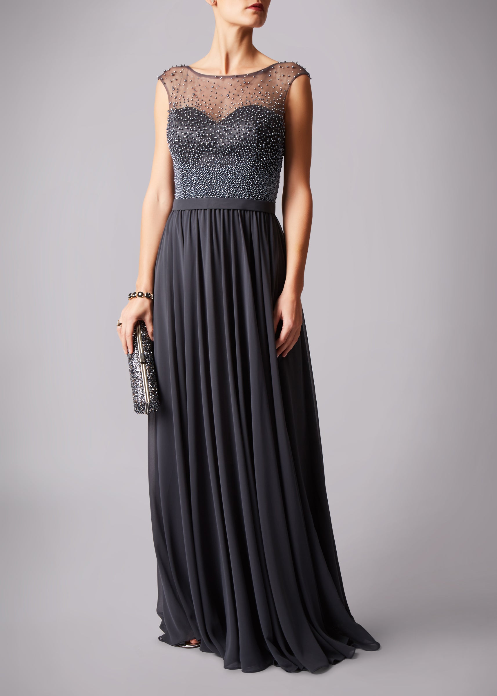 diamantés which dazzle under the light. The beautiful skirt pleats and flows elegantly from the waist down.